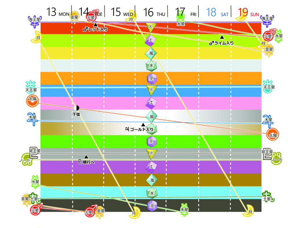 14日まで太陽が通過し、16日から19日には金星、18日から火星、19日から水星が通過します。