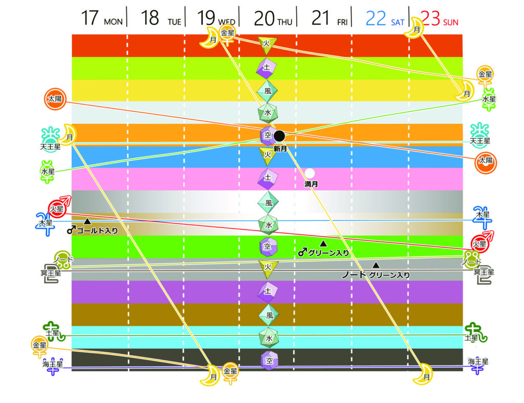 冥王星が通過中で、ノードは22日まで滞在します。17日から19日は水星、19日から21日は金星が通過。そして22日から太陽がIN。