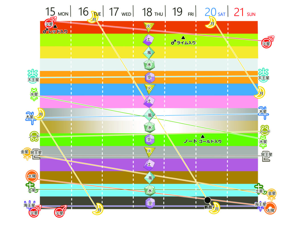 土星が滞在し、20日からノードが入ります。16日から19日は太陽、19日から21日は水星が通過。