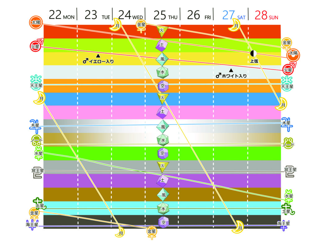 ノードと土星の影響が続く中、22日までは金星が滞在し、27日からは火星が通過します。
